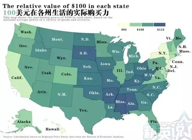 既然未来各位卖家搬砖到美国卖利润摊薄了,我们卖家朋友还是要想办法多卖点货,想办法提高利润,那Mark也只能帮个小忙,告诉大家美国哪里的钱好挣一些,那就是美国哪里的消费高物价高,美金的实际购买力弱的区域,钱越好赚,大家集中火力和精力在那些地方多卖点货就行了,到底美国哪些地方的美金实际购买力比较弱呢?如下图,颜色越淡的区域美金实际购买力越弱: