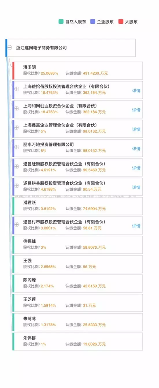 据亿邦动力网了解,赶街网的母公司“浙江遂网电子商务有限公司”第一大股东一直是赶街网创始人、CEO潘东明(潘冬明)。根据第三方软件,此前,潘东明持股比例约25%。