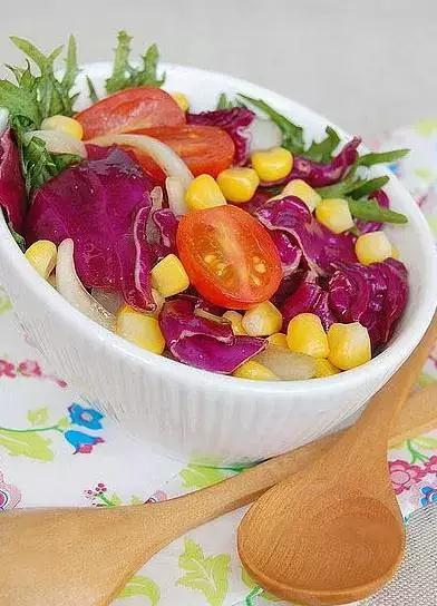 【原料】:紫甘蓝、小西红柿、苦菊、玉米粒(可生吃的蔬菜均可)