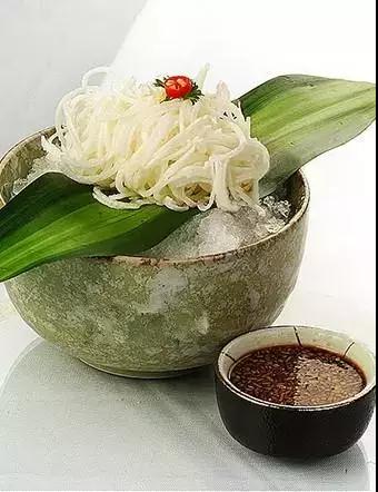 4、将冰块捣碎,放入碗中。上面放一片巴西叶,将山药细丝放在叶上、点缀小米椒圈、荷兰芹。