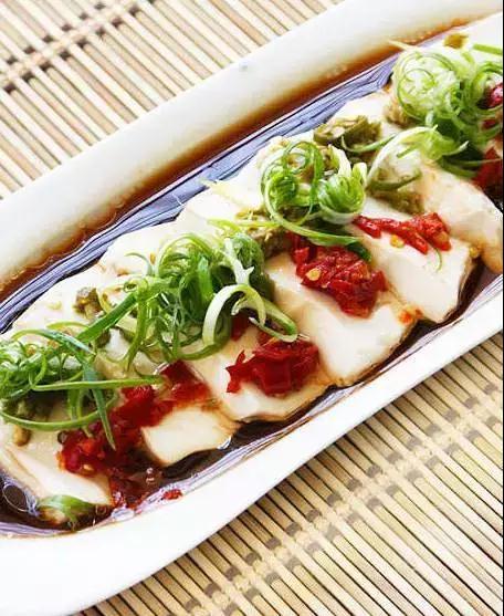 2、将两种颜色的剁椒分别倒在豆腐两侧并浇上酱油。