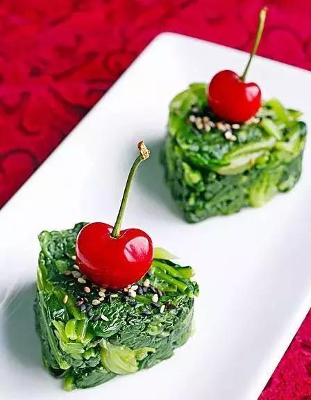 【原料】:菠菜250克、大樱桃2颗、芝麻少许