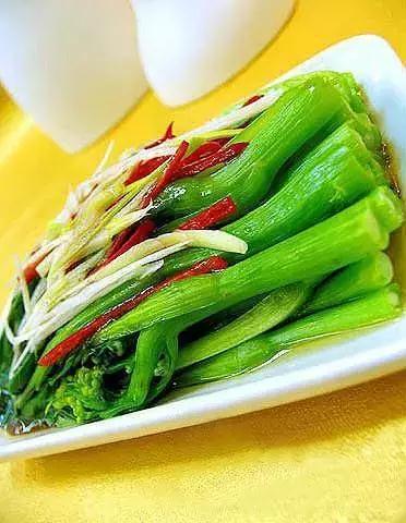3、锅内少许油,烧热后放入素蚝油、美极鲜味汁、红椒丝、素高汤煮至微沸,水淀粉勾汁后淋入菜心即可。