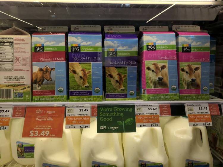 按照计划,一些有机食物,如牛油果、鸡蛋、三文鱼、嫩羽衣甘蓝、牛排、牛肉馅、黄油、牛奶苹果等生鲜,以及全食自有品牌如 “365 Everyday Value” 商品都有不同程度的降价。至于降幅,原价 5 美元内的产品降价 50 美分到 1 美元不等,比如明星产品有机牛油果从 2.99 美元降到 1.99 美元;更贵的商品降幅相对更大,一盒烤鸡的价格从 13.99 降到了 7.99 美元。