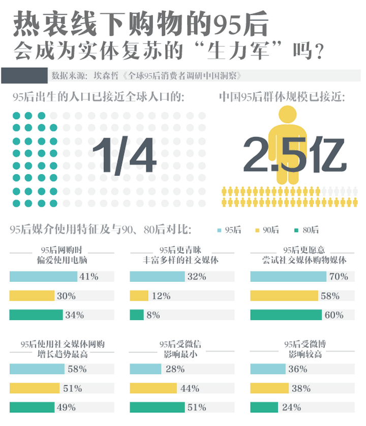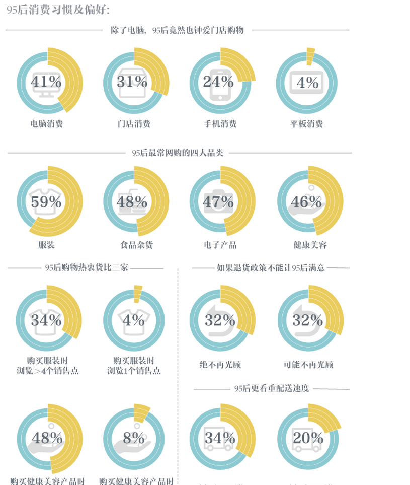 出乎意料的是,报告显示在95后购物途径中,实体门店购物竟然排在第二位,远高于用手机或平板购物。不知这一消息能否为疲软的实体经济打一剂强心针。