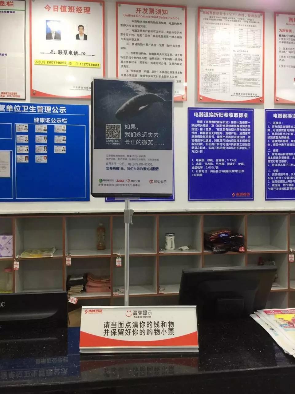 步步高集团充分利用规模化的公众聚集场所宣传“留住长江的微笑”项目,营造99公益日“人人可公益”的氛围,公司在湖南、江西、广西、四川、重庆的超市、百货、家电、便利店等多业态528家门店,全面投放统一设计的公益海报,带动公众一起支持这一环保项目。