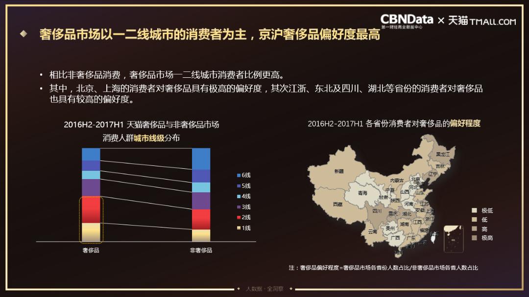 8月21日,第一财经商业数据中心(CBNData)联合天猫发布了《2017年新零售时代奢侈品消费趋势报告》(以下简称为CBNData《报告》)。基于阿里巴巴大数据,深度洞察新零售时代奢侈品消费者特征,CBNData《报告》显示年轻人群和女性消费者是奢侈品市场的主导人群;年轻消费者、小城消费者和平价消费者成为新零售时代奢侈品消费三大新势力。同时CBNData《报告》显示了线上奢侈品消费的三大趋势:品类日常化、品牌小众化和消费常态化,完善的线上奢侈品购买流程、体验和质量保障进一步驱动了中国消费者的线上购买,新零售业态正逐渐成为奢侈品消费的新选择。