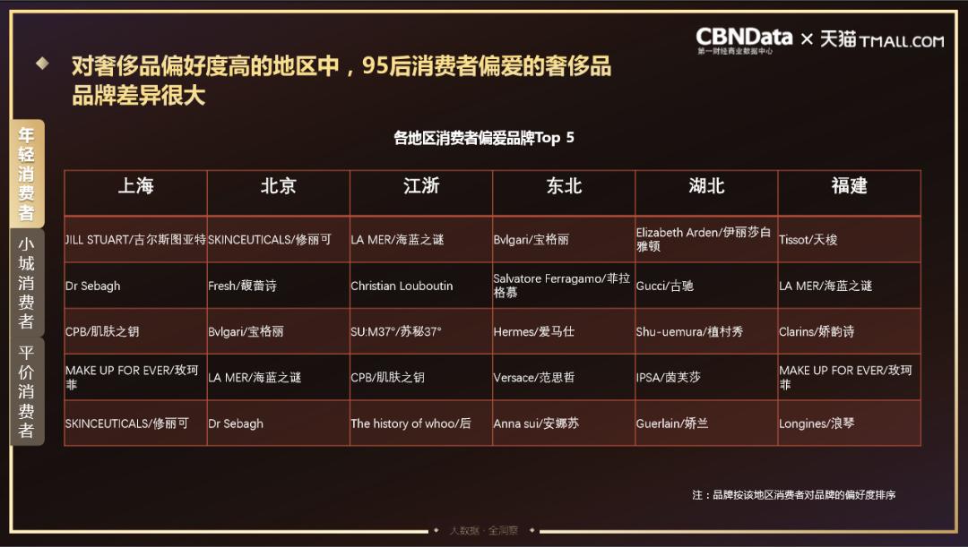 从地域分布来看,对奢侈品具有较高偏好度的95后主要集中在上海、北京、江浙、东北、湖北省及福建省,而他们所偏爱的奢侈品品牌差异很大。