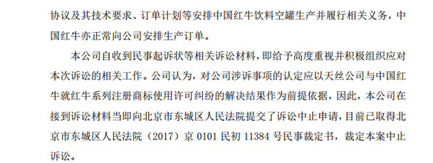 此外,奥瑞金目前在公告中同时透露称,天丝公司与中国红牛关于红牛系列注册商标使用许可纠纷尚处于解决过程中。