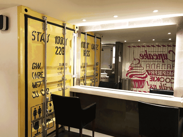 这是一个个性十足的工业涂鸦主题卫生间,女厕红黄撞色十分亮眼。设计漆桶形状的台盆底座上印着热辣红唇。男厕则以黑白色调为主,多了几分不羁的酷劲。
