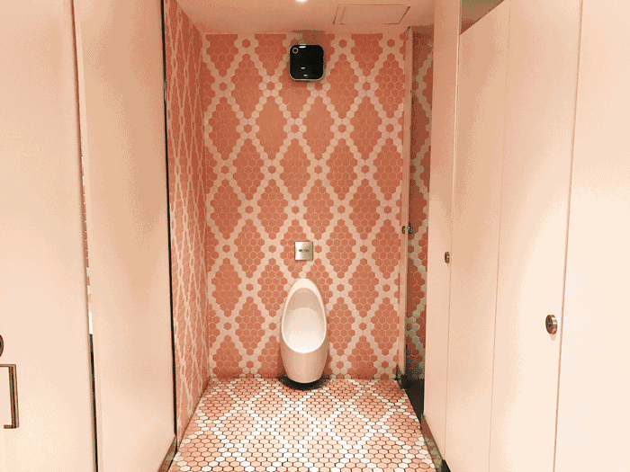 左右还两边的如厕区则设计成了粉红、粉蓝色调,一个洗手间内呈现出三种视觉效果。