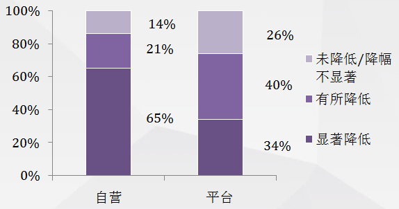 19%的制造企业委托网络零售平台进行仓储管理,71%的制造企业认为委托电商平台仓储对于其库存成本的降低有显著帮助;高达65%的制造企业反映自营电商能够大幅度降低与供应商协调的员工数量,比平台电商高出31个百分点;69%的制造企业认为,使用网络零售平台能够带来其采购成本的降低。