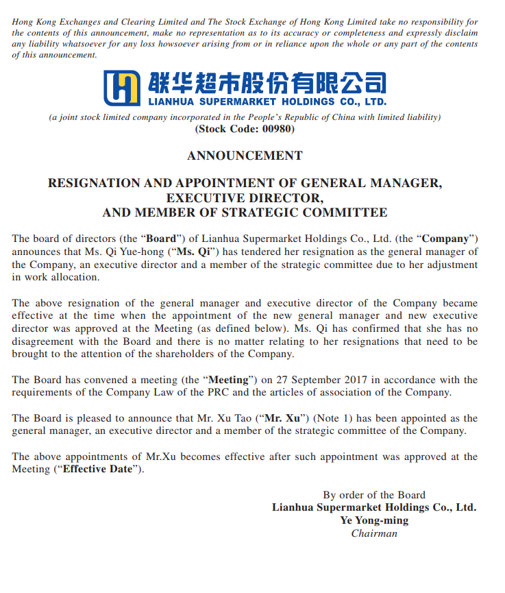 龙商网消息:9月27日晚,联华超市发布公告称公司董事会宣布,因工作调动,公司总经理、执行董事及战略委员会委员祁月红已辞任,2017年9月27日起生效。同时,董事会进一步宣布,徐涛已获委任为本公司总经理、执行董事及战略委员会委员。上述委任于会议上该等委任批准时生效。