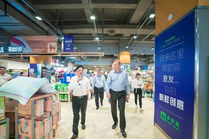 位于梅溪新天地B1层的步步高超市已经提前进入国庆模式,人气盎然。王填董事长自豪地向多马涅夫斯基主席一行介绍了步步高的第三代大卖场,近年来,国外零售业巨头大举进军中国加剧了零售业的竞争,但中国本土零售企业是遇强则更强。正如华为突破重重困难扛起中国品牌大旗,中国企业已越来越强。在海鲜区域,一边是装有鲜活的波士顿龙虾、帝王蟹、面包蟹水箱,另一边就是厨师烹饪现场,考察团对这种超市里的餐饮模式无不赞叹。