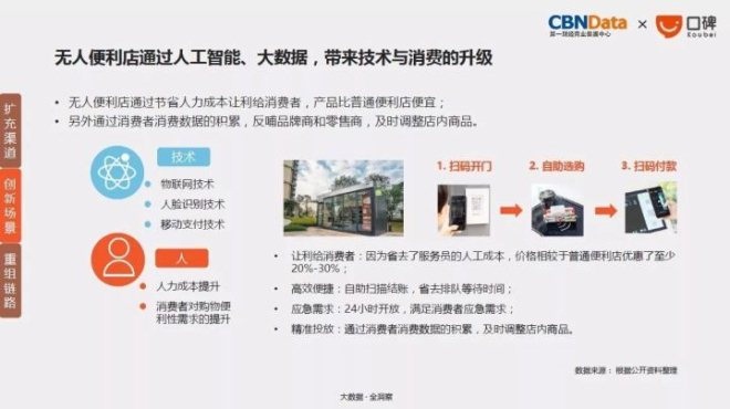 这是消费者已经可以感受到的变化,而未来,“无人”的概念也正加快步伐进入人们的生活。根据CBNData《报告》显示,无人便利店通过节省人力成本让利给消费者,产品比普通便利店便宜;另外通过消费者消费数据的积累,反哺品牌商和零售商,及时调整店内商品。与此同时,从2016年下半年开始涌现的无人值守货架,通过极大地缩短商品到用户之间的距离,比便利店更加灵活、分散,满足办公室一族“最后几百米”的终极便利诉求。
