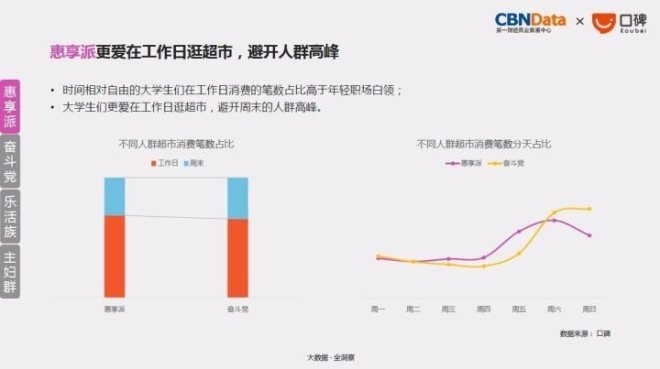 惠享派集中在18-22岁的大学生族群。跟年龄相仿的初入职场的白领人群相比,在超市的单笔消费低很多;同时他们很精打细算,使用优惠券的人群比例高于初入职场的年轻白领。与此同时,时间相对自由的大学生们更爱在工作日逛超市,避开周末的人群高峰。