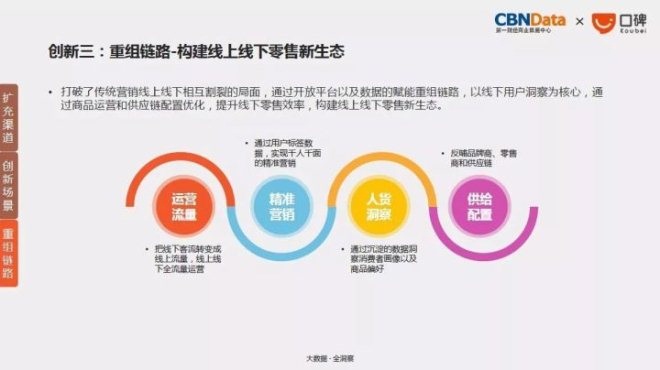 CBNData《报告》指出,要打破传统营销线上线下相互割裂的局面,可通过开放平台以及数据的赋能重组链路,以线下用户洞察为核心,通过商品运营和供应链配置优化,提升线下零售效率,构建线上线下零售新生态。