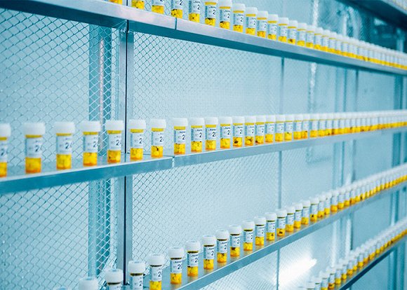 整家店通体白色,冷光的日光灯使得整个空间泛着青光,显得清冷异常。好在门店收银台背景墙上的橘色十字架霓虹灯,以及摆在货架上盛装药片的橘色药瓶子,为整个空间添了一些暖色。