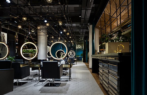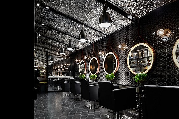 理发店如果只追求干净、整洁,很难给人留下印象。无锡一家理发店,就以奢华酒吧为灵感,把空间主色调定位黑色,在镜子上装上了灯管,用了各种造型奇特的灯具,通过墙面印花,家具选择,来把空间填满。