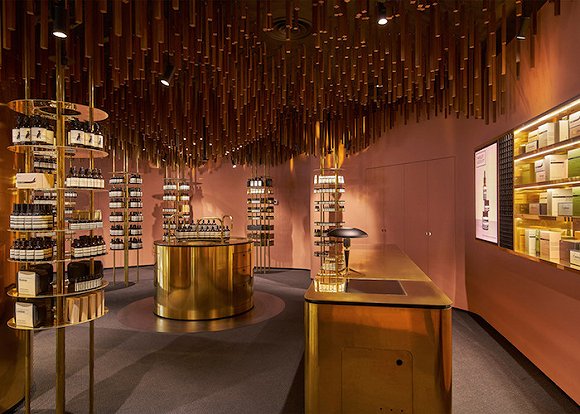 那个你印象里多少有些冷淡的化妆品品牌Aesop,这次在挪威建筑事务所Snøhetta的安排下,被放进了一个金碧辉煌的空间里。别说,深棕色的瓶子和金色还挺配。