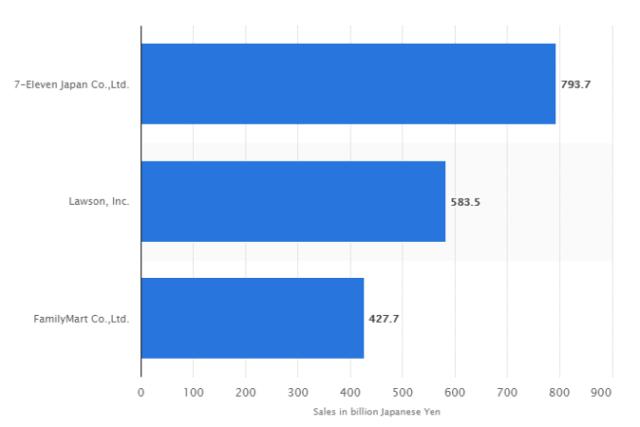 ▲2015年7-11、罗森和全家三个连锁便利店的营收(图片来源:Statista)
