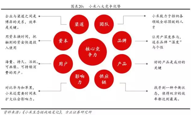 “八大优势”助力小米生态企业脱颖而出。小米的优势包括团队、产品、品牌、用户、供应链、渠道、资本和影响力。小米一直以来招纳各领域全球顶级的人才,组建成了一支最优秀的团队。通过优秀的人才做出最好的产品,打造出有“温度”、有个性的品牌。