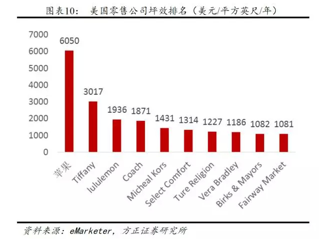 苹果的品牌价值决定了高客单价,而小米定位超高性价比产品,根据最新研究报告,苹果门店的平均坪效为5546美元/平方英尺,接近40万元/平方米每年,在美国各大零售业态中排名首位。小米之家坪效为27万元/平方米,同样远超过便利店等普通零售业态。
