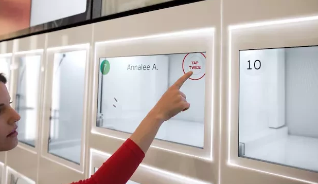在你面前,是显示有你姓名、甚至所点餐食的营养数额、卡路里等信息的透明电子屏,轻触打开,取出食物,餐厅基本的全流程到此都完成了。