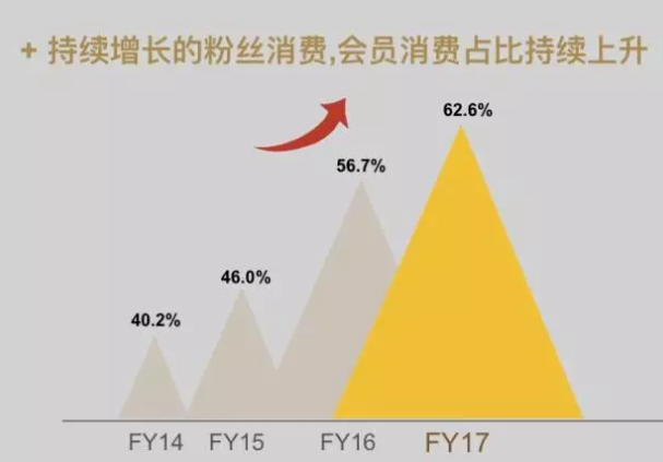 期内,集团已经拥有会员账户逾200万个,其中微信账户数逾150万个。在 2017财年,会员所贡献的零售额占零售总额的62.6%,集团的活跃会员账户数目已超过26万个,2017财年购买总额超过人民币5000元的会员账户数目逾11.8万个,其消费零售额亦达到人民币14亿元。