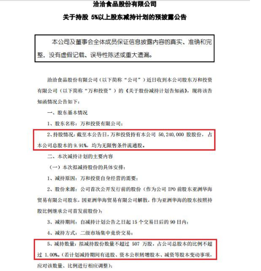 11月2日,洽洽食品公告了股东万和投资有限公司的《关于股份减持计划告知函》。
