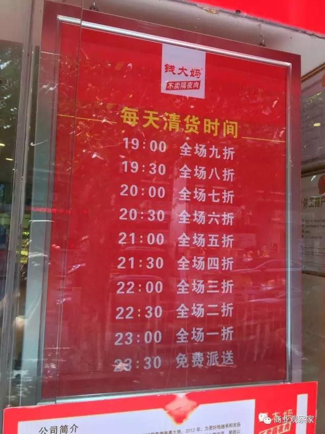 钱大妈门店是采取到点打折的模式,即在晚间时段,每隔半小时设置一个更低折扣价格清货,到最后时刻,如门店还有库存,则直接免费送给消费者。