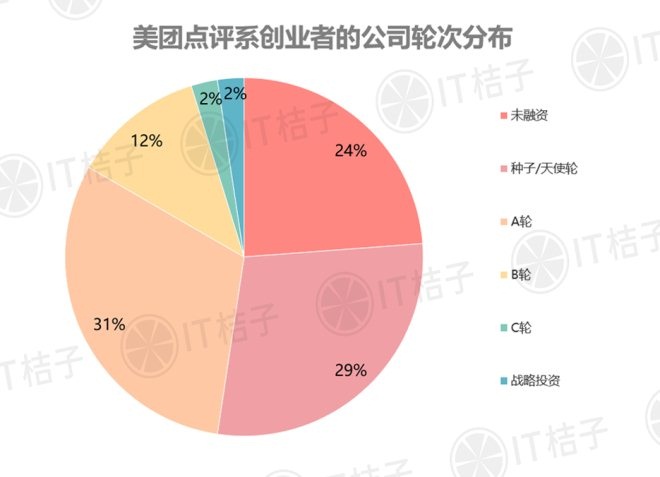 美团点评系创业者拿到投资的比例达到 76%,获投率还是非常高的。其中,早期投资(A 轮及以前)占比达到 60%,中后期占比达到 16%,32 家获投公司共拿到 40.59 亿人民币资金。可见,创业者的背景还是备受投资人关注,因为早期投资主要还得看人啊……
