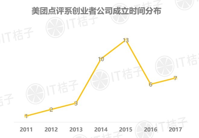 IT 桔子数据显示,美团点评系创业者出来创业的时间最早可追踪到 2011 年。其中,2015 年为创业的高峰期。一方面,2015 年中国的整个创投领域都处于一个高峰期;另一方面,美团和大众点评在 2015 年合并,形成了新的美团点评集团,一些员工因此选择出来创业。