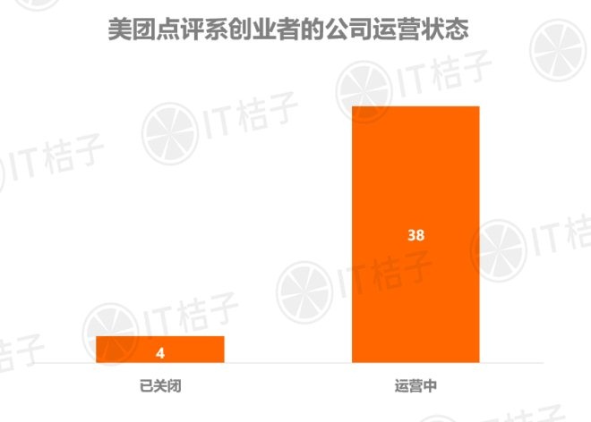 从公司的运营状态来看,目前美团点评系创业者的公司有 4 家处于已关闭状态,另外 38 家在正常运营中。创业是个高风险的游戏,失败的概率很大,但美团点评系创业者目前的失败率还不到 10%。