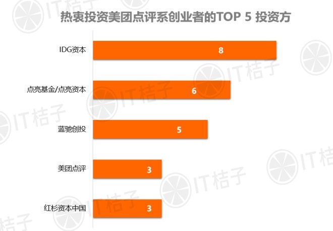 从投资美团点评系创业者的资本方背景来看,IDG 资本、点亮基金/点亮资本、蓝驰创投、美团点评、红杉资本中国是热衷投资美团点评系创业者的 TOP5 机构。其中,点亮资本/点亮基金是由前大众点评网联合创始人龙伟、李璟联合创办,所以热衷投资美团点评系的创业者也就不奇怪了。