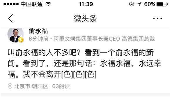 阿里巴巴公关部一开始时对界面新闻记者表示,对外界传言不予置评。随后,阿里巴巴公关委员会主席王帅发朋友圈表示,俞永福不会离职。11点半左右,俞永福本人出来辟谣,发微博否认离职传闻: