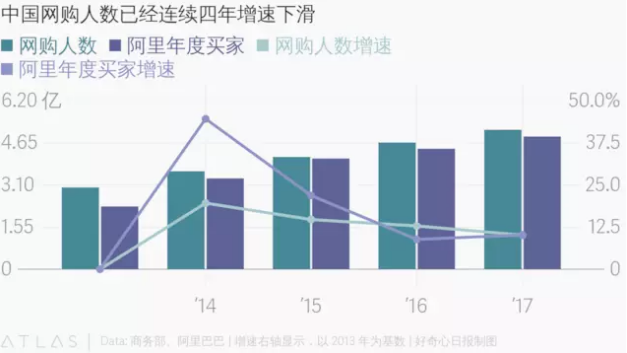 根据中国商务部、工信部披露的数据,中国网购人数增速连续四年下滑,截止到今年 6 月,中国一共有 5 亿网民在网上买过东西、同比增速从四年前的 20% 掉落至 10%。