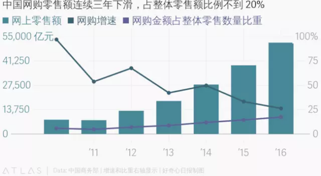 但事实上,中国网购零售总额的增速也已经连续三年下滑。2016 年 5.5 万亿网购销售额只占中国整体零售市场 19% 的份额。余下超过 80% 的份额,是马云、刘强东们大力做线下的动力。