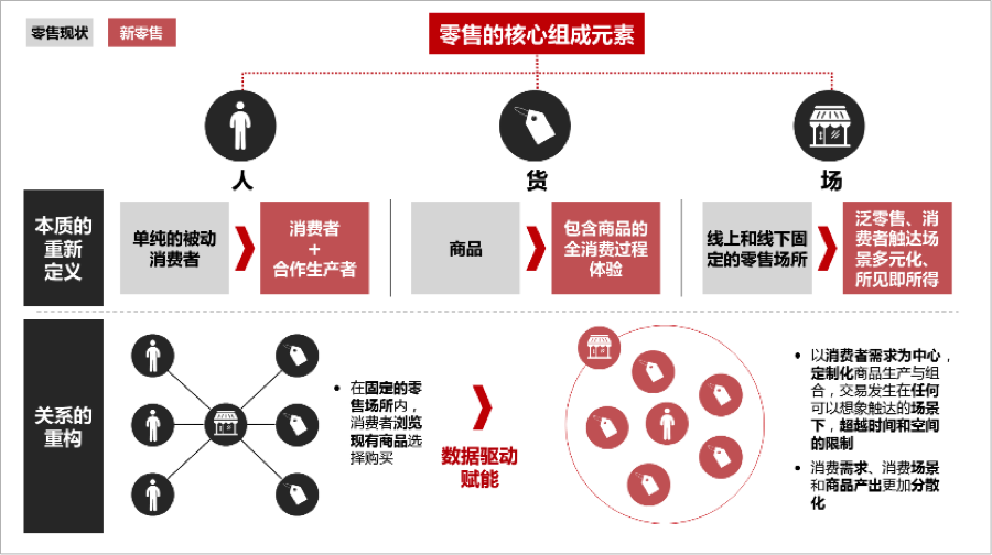 贝恩和阿里研究院这一次也试图进一步对新零售进行解读。我们认为首先它有两个层面,首先是在数据驱动的情况下,人货场这三个要素实现的重新的定义,人不是由原来的一个被动的接受的消费者,他既是消费者,又是生产者,在数据驱动化的情况之下,真正形成的品消共创的新型的人,帮助品牌持续的传播,这是一种新的人。