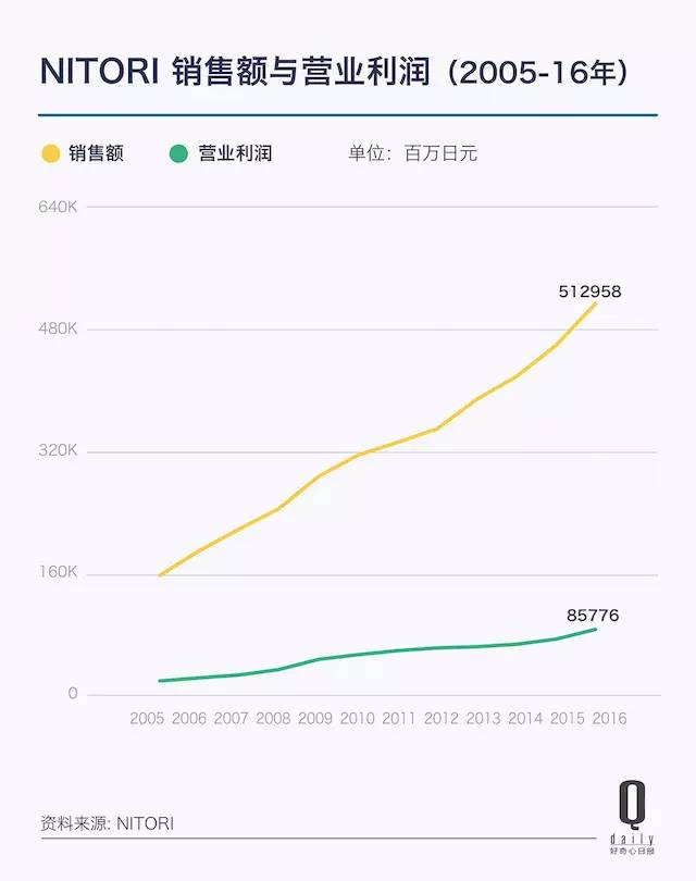 截止 2 月 20 日的 2016 财年,NITORI 销售额达到 5129 亿日元(约合 46 亿美元),是宜家日本销售额的近7倍!