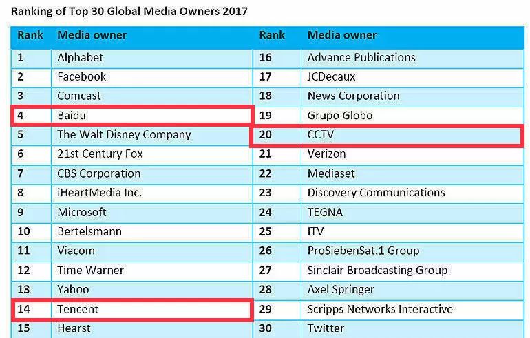 第三方机构Zenith会定期发布全球30大媒体主,其实就是最受广告主青睐的媒体排名。在今年的30大媒体主中,有三家中国公司,分别是第4名百度,第14名腾讯,和第20名央视。