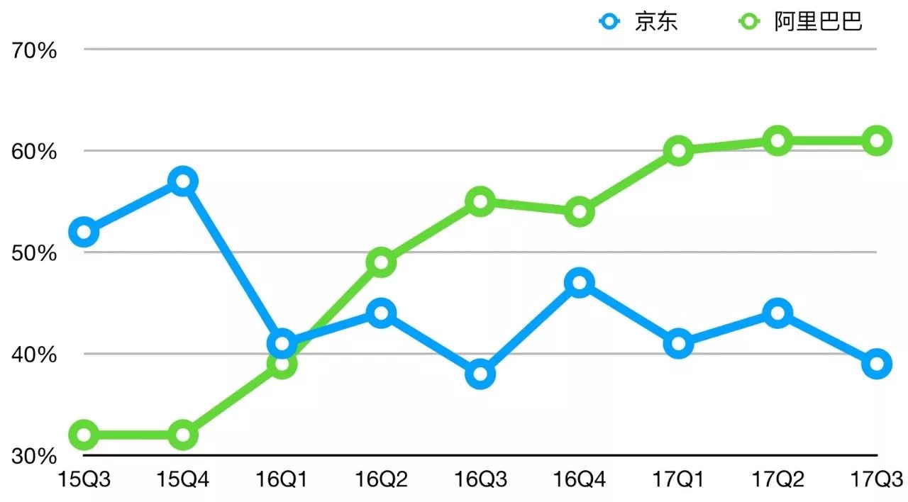 京东的营收增速则从两年前的50%多,降至不到40%。从2015年第三季度到2017年第二季度,两年中阿里巴巴营收总共增长了126%,尽管同一时间内京东营收也增长了111%,但很明显,追赶者还不如被追赶者跑得快,差距确实没有可能缩小。如果两种模式最终的成长性可以代表各自模式的优越性,那么从数字上看,京东模式并不具有其自认的优越性,或者说,优越性尚未得到发挥。