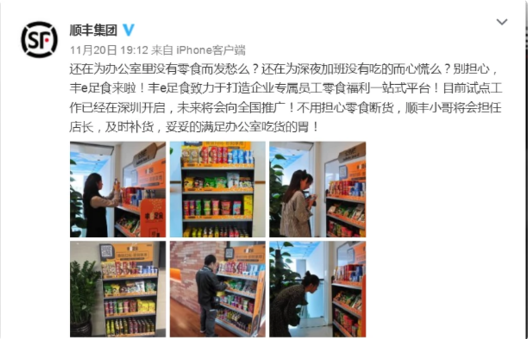 11月20日晚,顺丰集团官方微博发布了一组图片,称其打造了企业员工零食福利平台“丰e足食”,目前试点工作已经在深圳开启,未来将向全国推广。至此,继京东、饿了么、盒马鲜生之后,又一巨头进入无人货架战场。