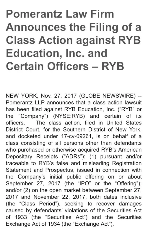 Pomerantz LLP宣布,针对RYB教育公司(简称“RYB”)和公司和某些管理层的集体诉讼已经向美国纽约南区法院提交,诉讼代码是17 - cv - 09261。