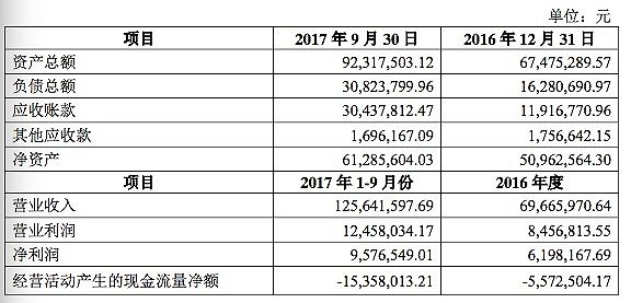 与此同时,方贺兵、方林宾等主要股东也向桂发祥做出了业绩承诺,承诺2017-2019三年间的净利润分别不低于1690万元、800万元、2200万元。据公告中披露的昆汀科技财务数据,2016年度和2017年1-9月昆汀科技的营业收入为6966.6千万和1.26亿元,净利润分别为619.81万元和957.65万元。