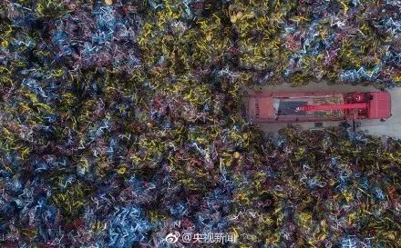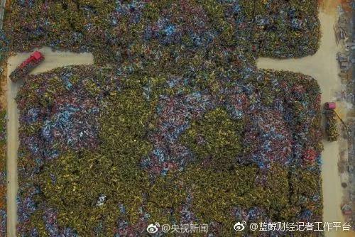 近期,在福建厦门一堆场,暂扣的共享单车堆成“小山”。拉车师傅说,每天要处理1000多辆,光这里就堆了近10万辆。