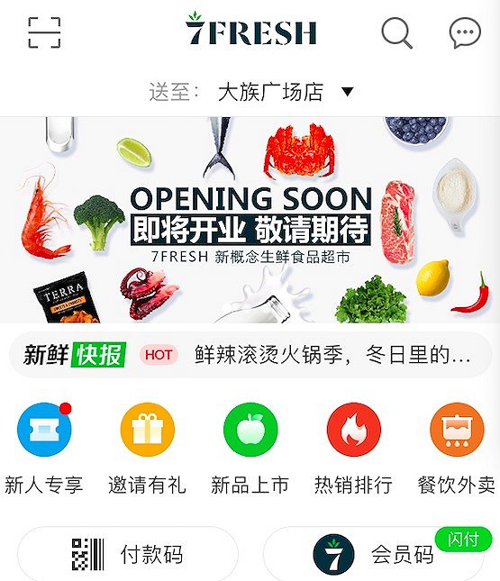 一名客服人员告诉界面新闻,大族广场店12月29日试营业5天后,将在1月4日正式开业。实际上,从12月18日前后,7FRESH已经在大族广场周边五公里范围内开始地面推广,并接受线上订单,进行无门槛配送服务。门店开业之后,大族广场店内也会提供海产品、肉类等现场烹饪的熟食。大族广场店外,另一家位于华润五彩城的7FRESH将于1月10日试营业,但后者的面积不到3000平方米。