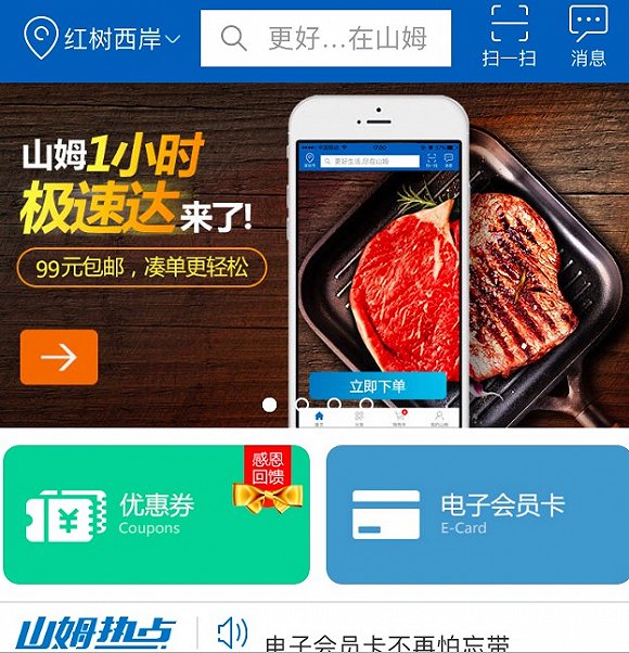 在和京东合作一年后,沃尔玛山姆会员店也开通了类似京东到家的业务——“1小时极速达”。