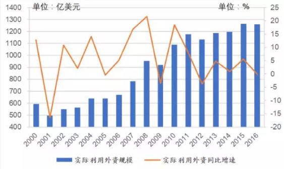 图11:2000-2016年中国实际利用外资情况