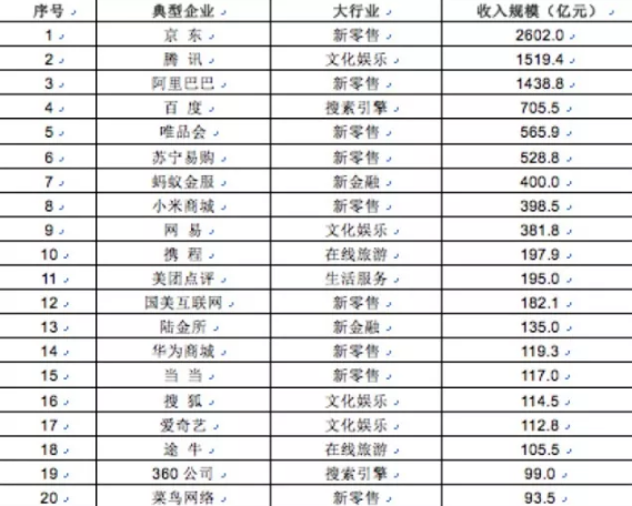 表2:2016年中国互联网企业收入前20排名